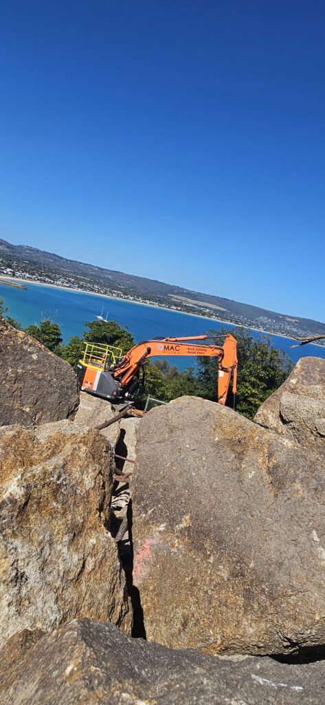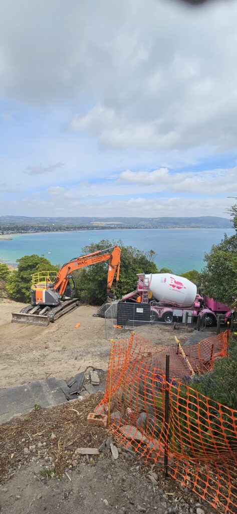 This job was a pleasure, with a magical view overlooking the bay and Arthur's Seat. With the magic views come difficult access for deliveries, but nothing DMAC can't handle. Due to the dramatic slope of the land, a retention system was designed to retain the back of the property. Using our 22T Hitachi excavator, we drilled down to 7.4m, with varying ground conditions calling for core barrels to get through some hard granite layers.